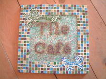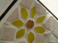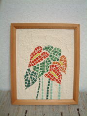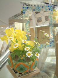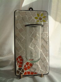 | Flower Vase 壁掛け一輪挿し マーブルモザイクと合わせてみました。 お花の部分はピッコロモザイクを単色に バラしたものをカットして製作。 おかげさまで売れました。 |