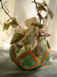 雑貨やさんの花びんを使い ピッコロ+ビーズモザイクでデザイン ピッコロの周りには麻ひもを ぐるぐるまいてみた |