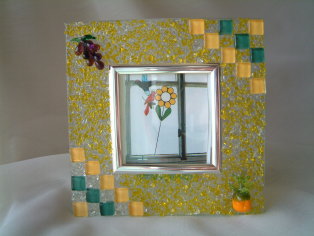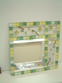 マルチカラーのポットプレート (鍋敷き) これは上とは打って変わって白の目地を使いカラフルポップに製作。一つあるだけでキッチンが元気になるビタミンカラー。キララモザイクは大好きで楽しくてやめられません 2010 |