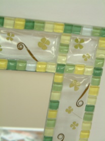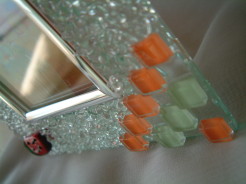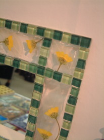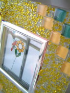 | 押し花の ガラス コースター ガラスコースターに キララを接着したあと 特殊な液で押し花を 閉じ込めました。 周りはかわいい ガラスペレットを 敷き詰めました。 ↓のミラーも同じ 工程で製作。 |